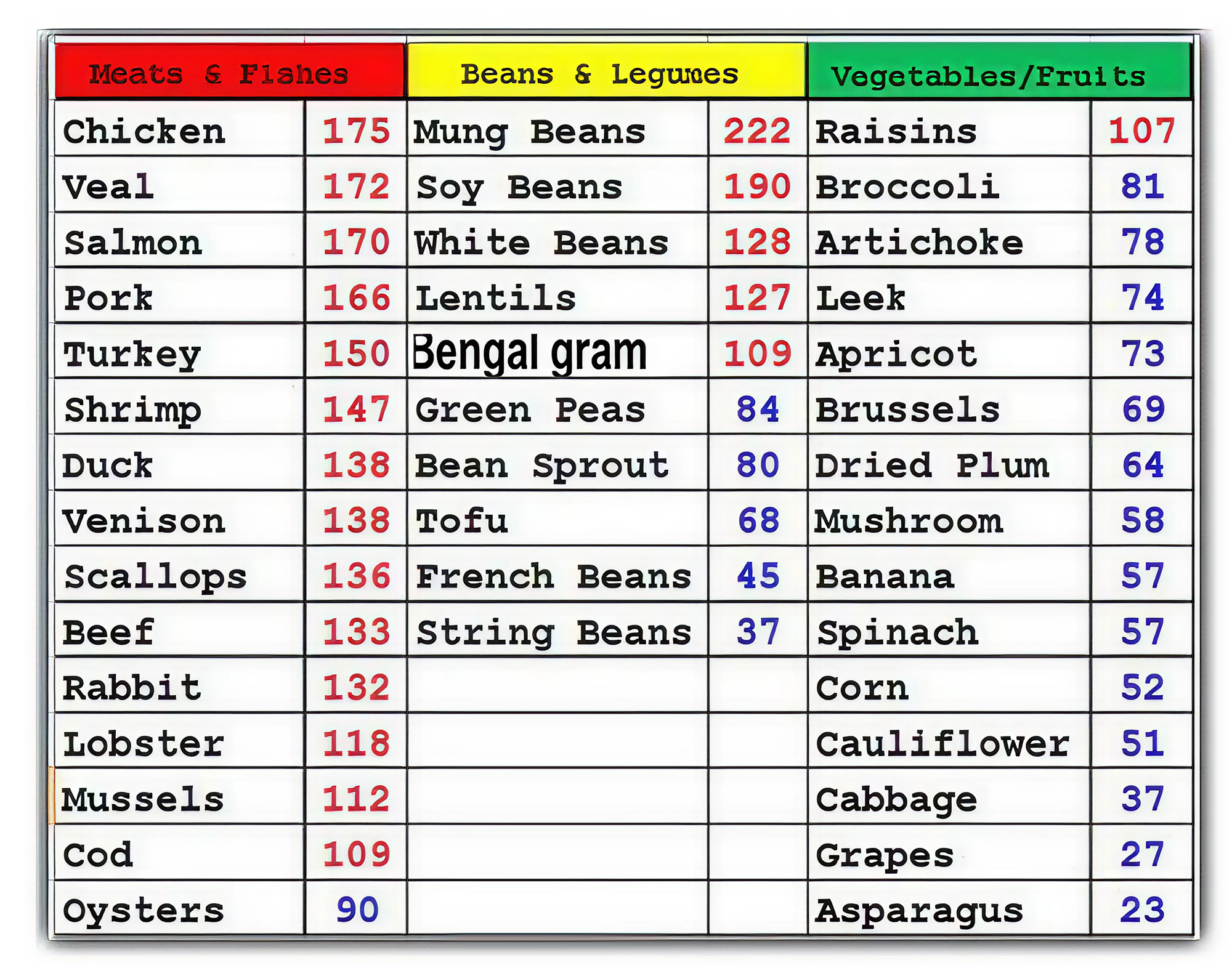 1. Red numbers indicate acidifying effect on the kidneys, while green numbers indicate alkalizing effect.